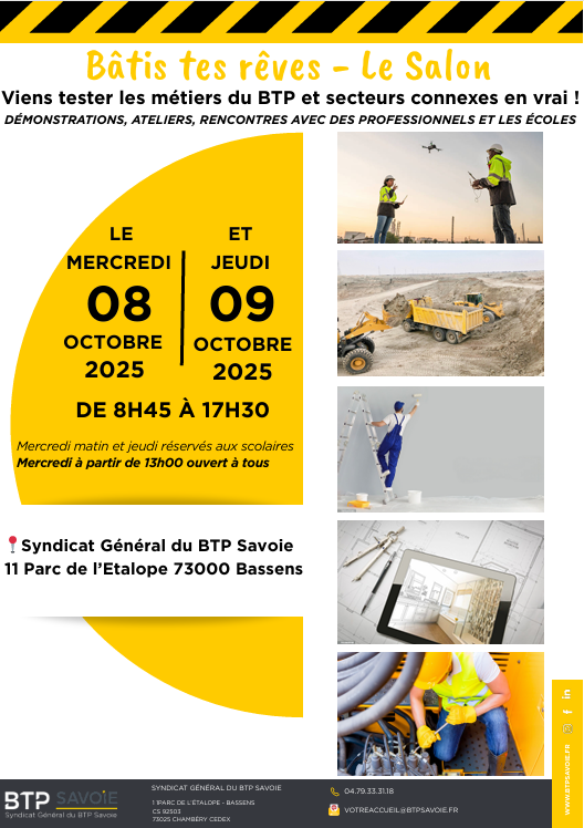 Dans la continuité de nos campagnes annuelles “Bâtis tes rêves !”, menées auprès des collégiens et lycéens savoyards pour promouvoir les métiers du BTP, le Syndicat Général du BTP de Savoie organise un salon exceptionnel les mercredi 8 et jeudi 9 octobre 2025, au 11 parc de l’Étalope à Bassens, à l’occasion de la Semaine du BTP lancée par France Travail.